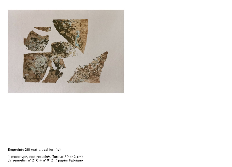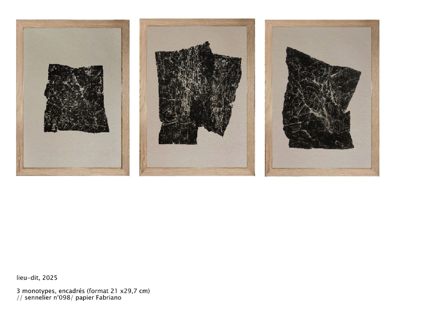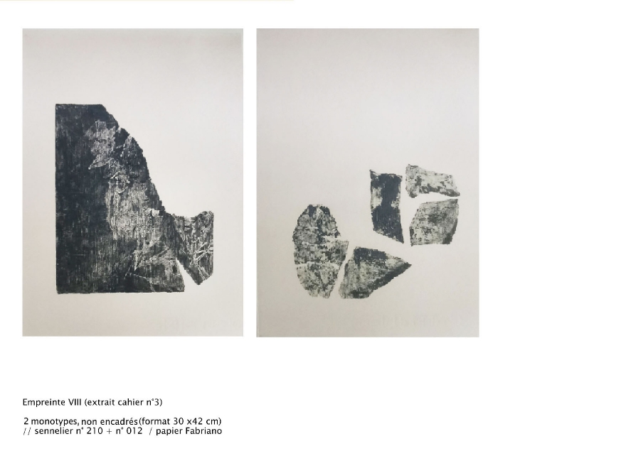 Cet ensemble constitue le récit d’un territoire ou les aspérités de la matière figure les paysages, constitué d’un ensemble de recherches effectués à partir de matière déposée sur une feuille de papier. Elle est pensée comme un herbier ouvert ou se livre les empreintes des "terrains en attente".