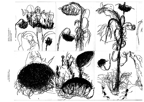 texte/image. Différentes approches et apparitions graphiques fusionnées et sublimées par l’impression noir et blanc comme dans un journal où chacun peut y trouver ce qu’ielle n’y cherche pas… Nancy Sulmont.